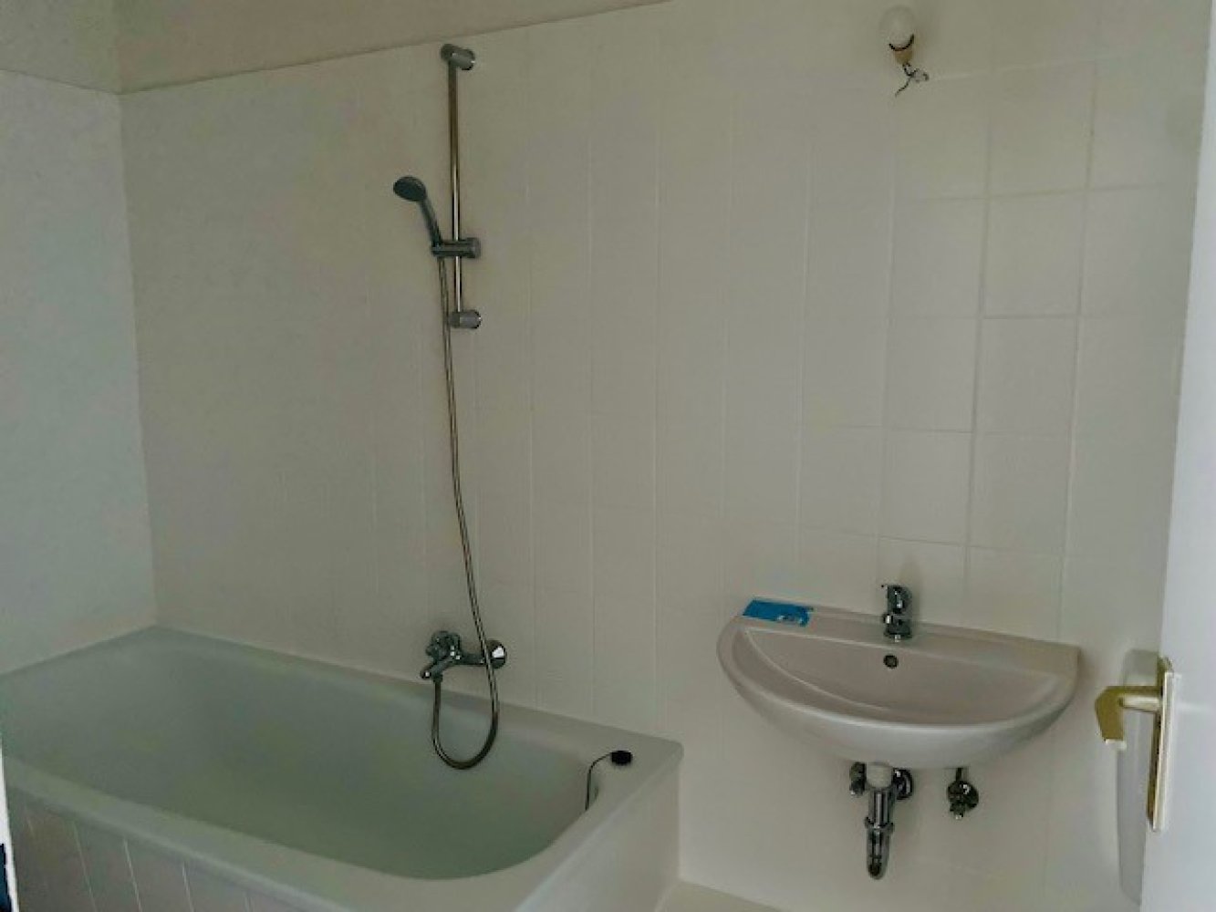 Die Wohnung verfügt über ein Schlafzimmer mit ausreichend Stellfläche für ein großes Bett und einen Kleiderschrank. Es gibt ein ein helles Badezimmer mit Badewanne, Waschbecken und WC. Die helle Tageslichtküche ist mit einer modernen Einbauküche inkl.