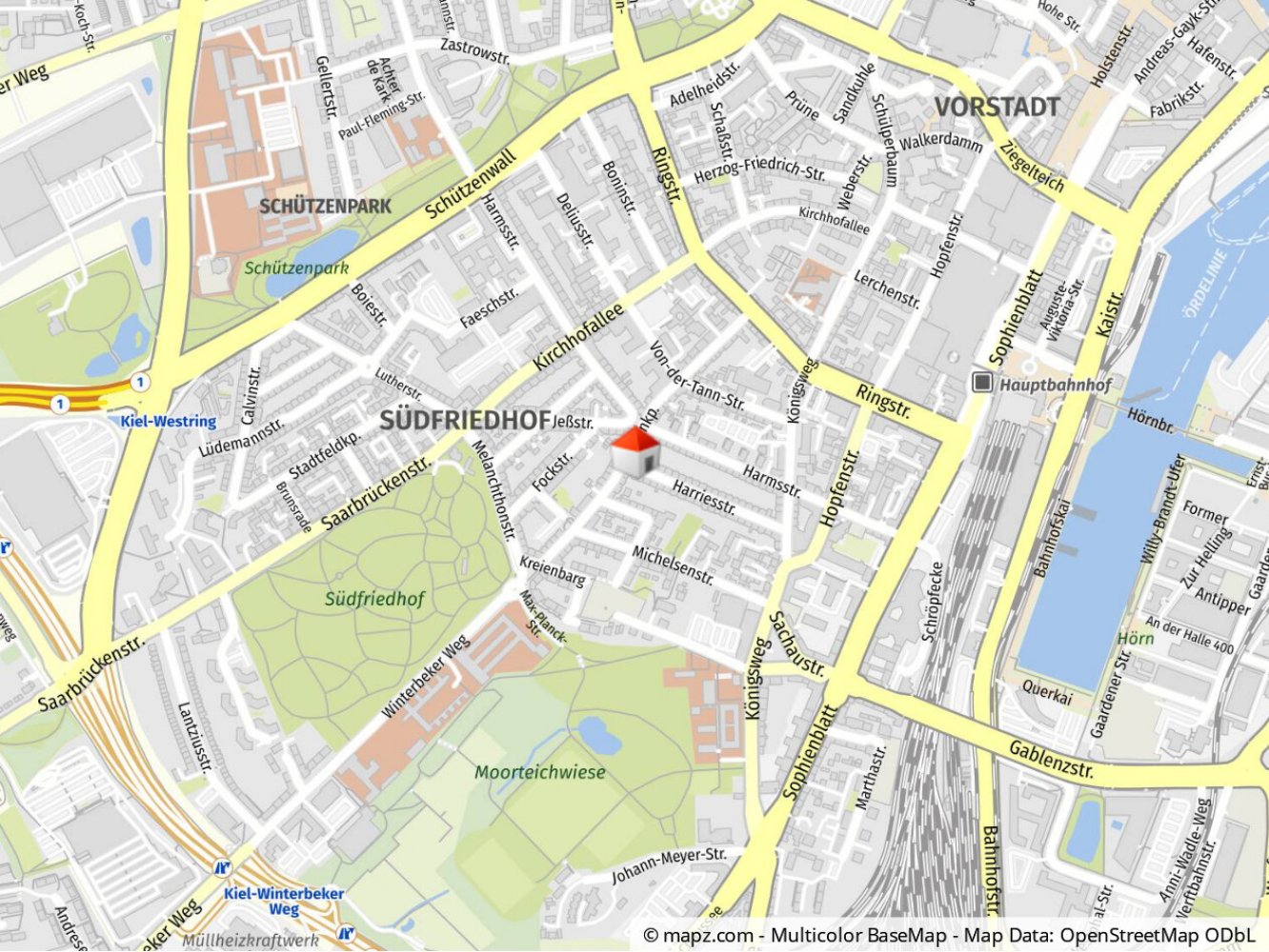 Das gut gelegene Mehrfamilienhaus befindet sich im beliebten Kieler Stadtteil Südfriedhof, ein paar Hundert Meter westlich der Kieler Förde und des Hauptbahnhofs. Die Lage bietet eine hervorragende Infrastruktur, grüne Parks und Freizeitmöglichkeiten und ermöglicht eine schnelle Erreichbarkeit aller für den täglichen Bedarf wichtigen Einrichtungen.
