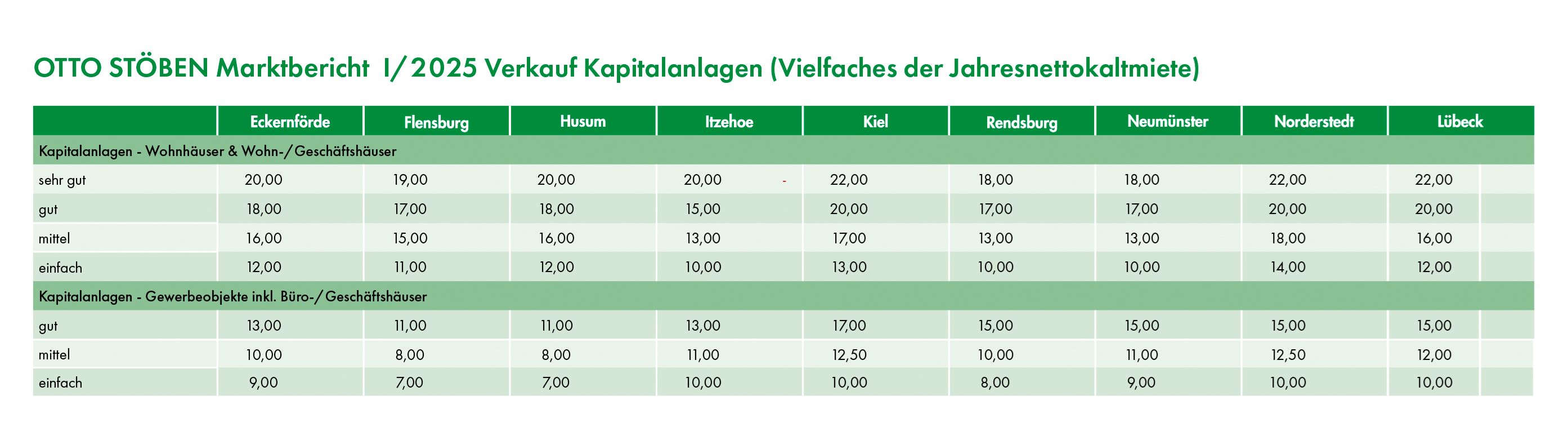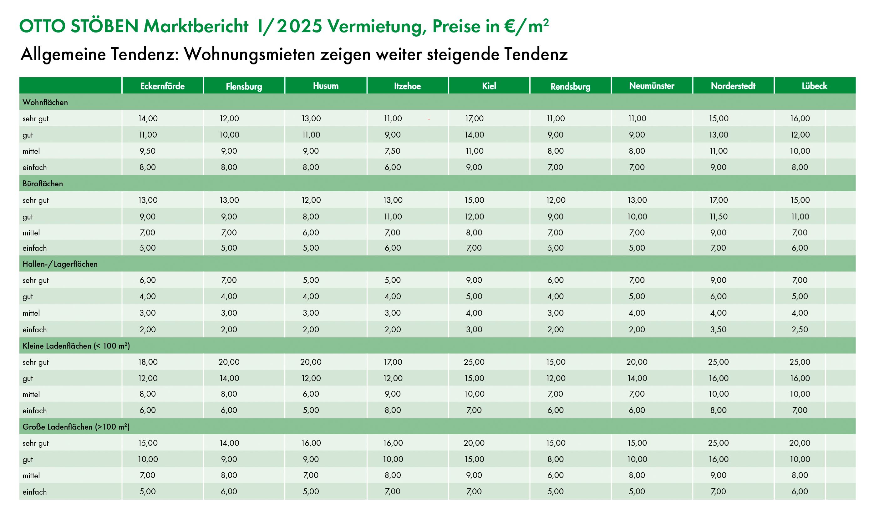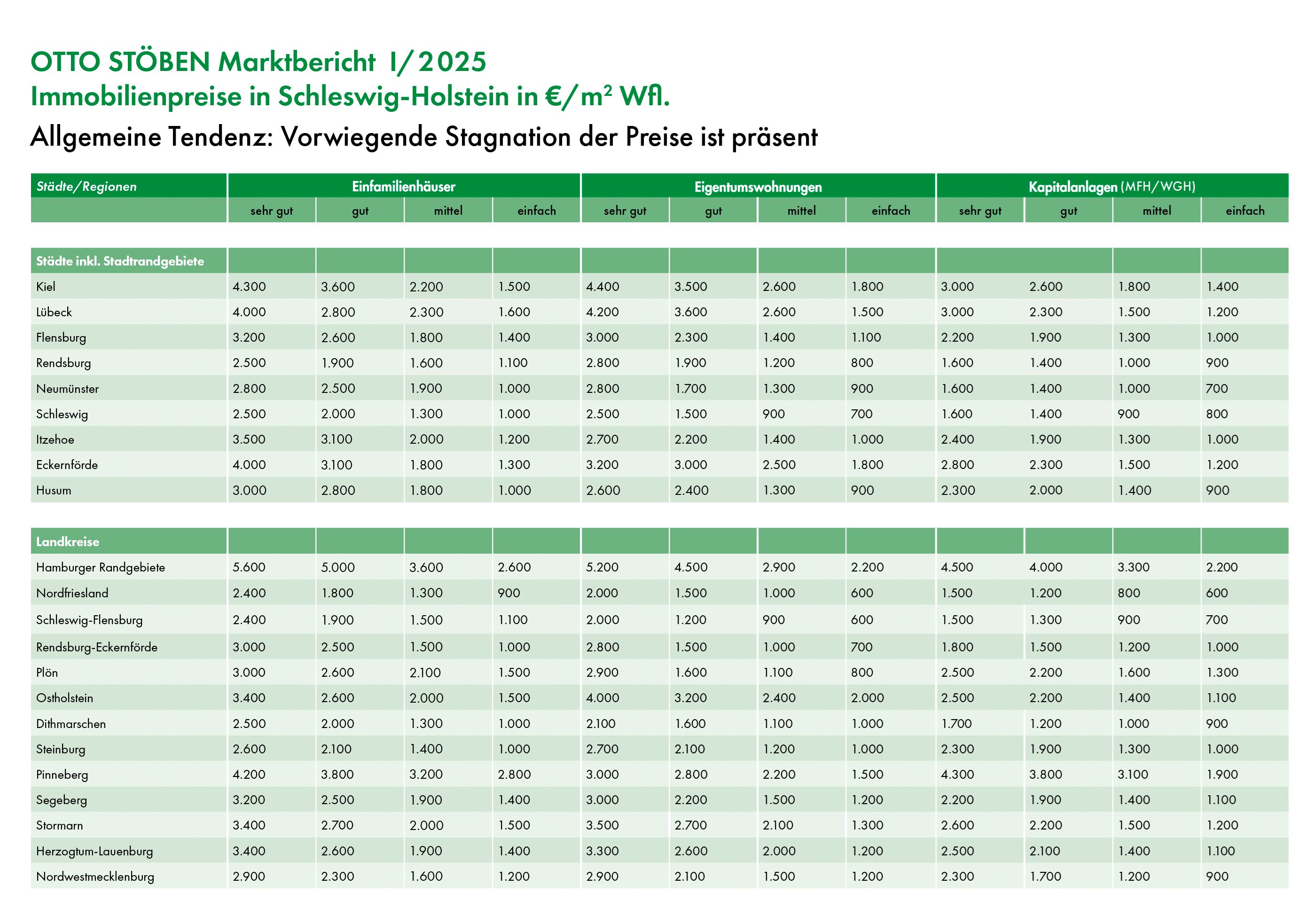 …stellt sich bei der Betrachtung der allgemeinen wirtschaftlichen Lage ein, ebenso bezogen auf die Lage am Immobilienmarkt. Im Bundesland Schleswig-Holstein war das Jahr 2024 vorwiegend geprägt von Stagnation, die nach unseren aktuellen Einschätzungen auch im ersten Halbjahr 2025 anhalten wird.