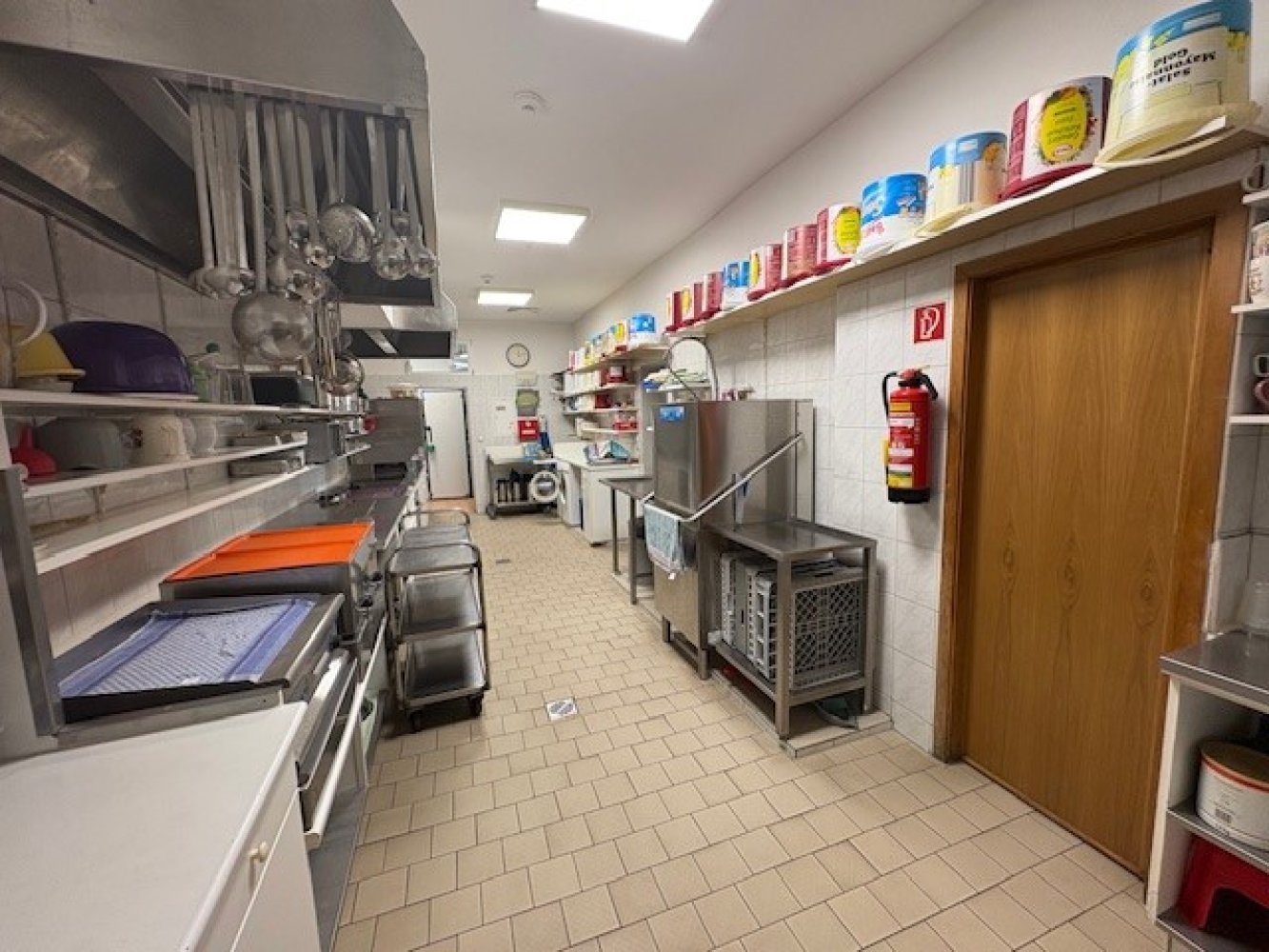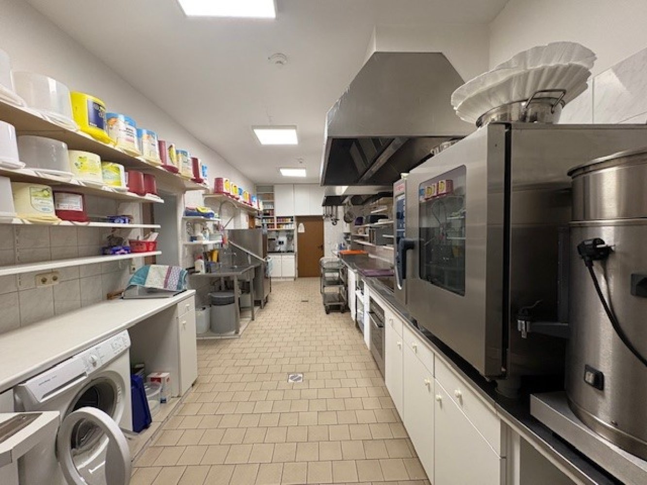Eine möblierte Gastronomie mit Barbetrieb und eine voll ausgestattete Großküche mit Kühlhaus ist vorhanden. Ebenso eine Küche im Foyer für die kleine Festivität. In mehr als ausreichender Anzahl sind Sanitärräume (Male, Female, Disabled) mit Wickelfläche im Femalebereich, sowie Lagerfläche, ein Büro mit Medienanschlüssen und eine Garage vorhanden.