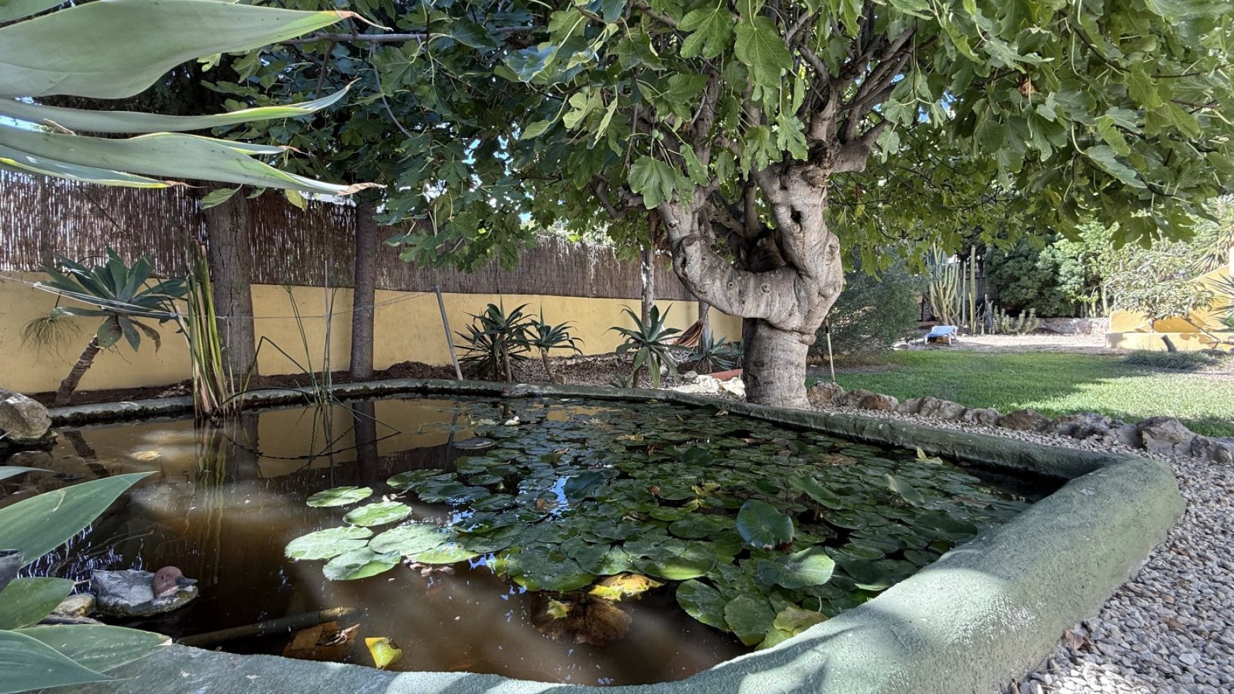 Der mediterrane Garten mit Rasen, einheimischer Bepflanzung und Teich verleiht dem Anwesen eine besondere Atmosphäre.