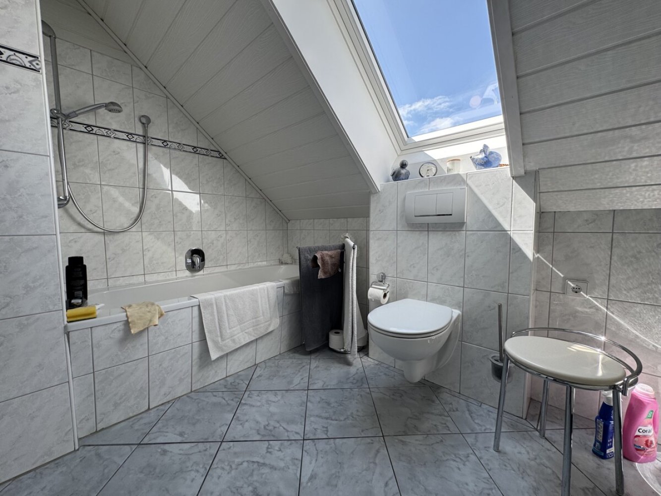 Im Obergeschoss befindet sich das großzügige Schlafzimmer mit Balkon und freiem Flussblick – ideal für den Start in den Tag oder entspannte Abendstunden. Ein großes Bad mit Wanne bietet Komfort und Platz. Zwei halbe Zimmer eignen sich als Ankleide oder Homeoffice.