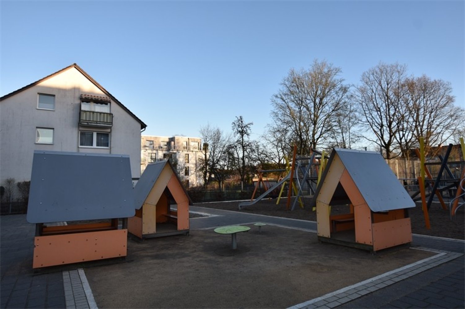 Sie betreten die Wohnung und gelangen in einen breiten Flur mit ausreichend Platz für eine Sitzecke vor der unmittelbar angrenzenden Küche mit Blick auf den Spielplatz. Hier können die Kinder ausgelassen in Sichtweite toben, während Sie zu Hause das Essen zubereiten oder es sich mit einer Tasse Tee in der Essecke gemütlich machen.