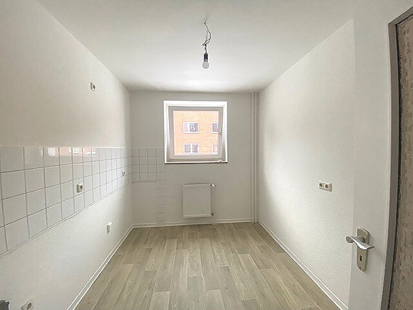 Aus dem geräumigen Flur mit angrenzender separater Abstellkammer mit ausreichend Stellfläche für eine Garderobe erreichen die Wohnräume. Das lichtdurchflutete Wohnzimmer mit bietet ausreichend Raum für eine Wohnlandschaft und Wohnwand und verfügt über einen Balkon. Aus dem Wohnzimmer ist auch genügend Stellfläche für einen Essbereich gegeben. Aus diesem erreichen Sie auch die Küche. Eine Einbauküche ist nicht vorhanden.