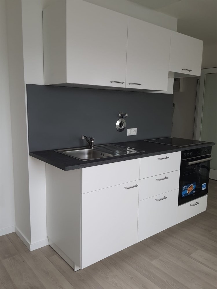 Aus dem geräumigen Flur mit ausreichend Stellfläche für eine Garderobe erreichen Sie einen großzügigen Wohn-Schlafbereich mit ausreichend Stellfläche für Wohnlandschaft Bett und Sitzecke. Die helle, in den Wohnraum integrierte Kochecke hat einen neuen großformatigen Fliesenspiegel erhalten.
