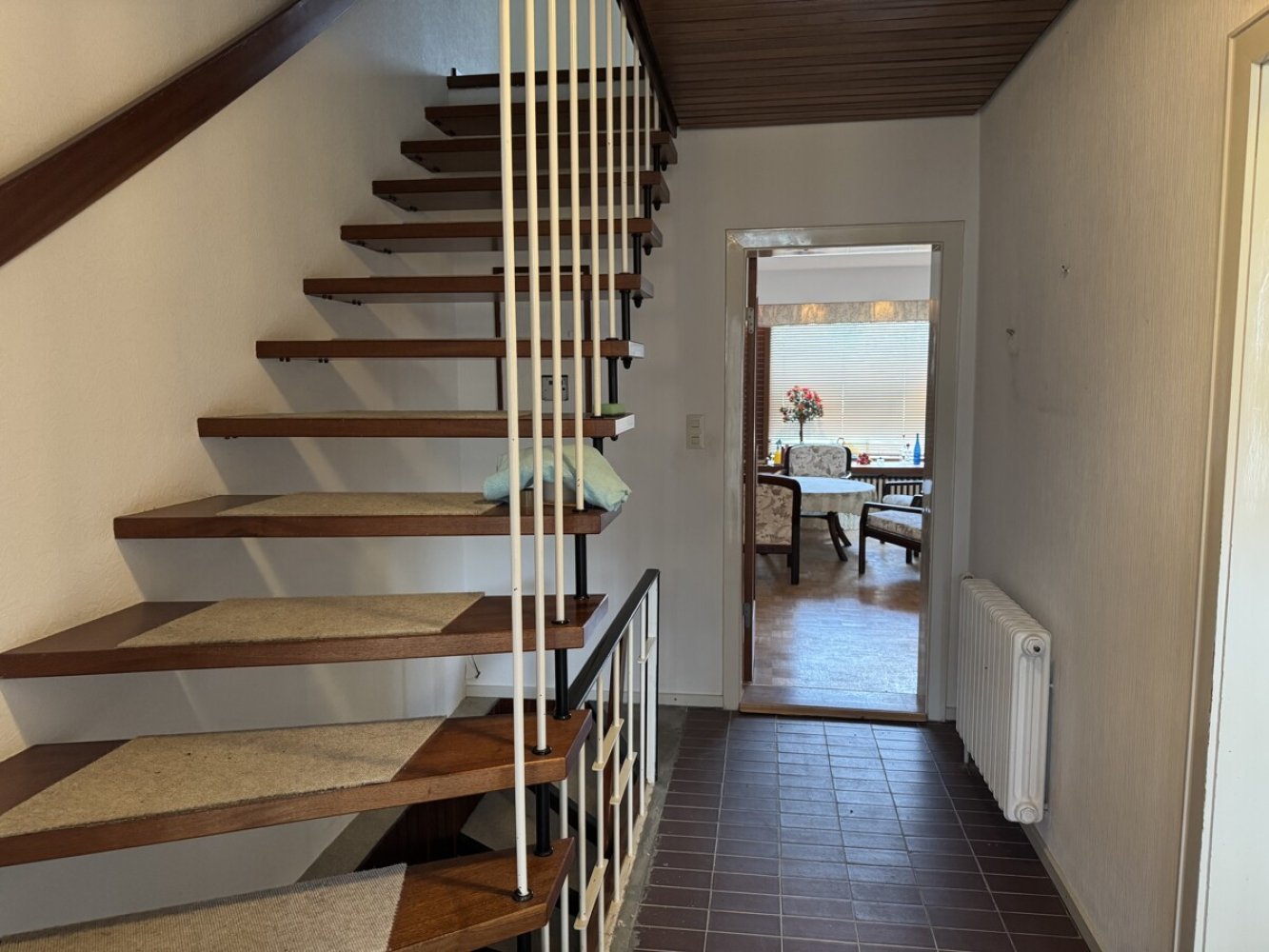 Beim Betreten des Hauses empfängt Sie ein Eingangsbereich, der ausreichend Platz für Garderobe und Stauraum bietet. Von hier aus gelangen Sie in den zentralen Flur, der als Verteiler in die verschiedenen Bereiche des Hauses dient.