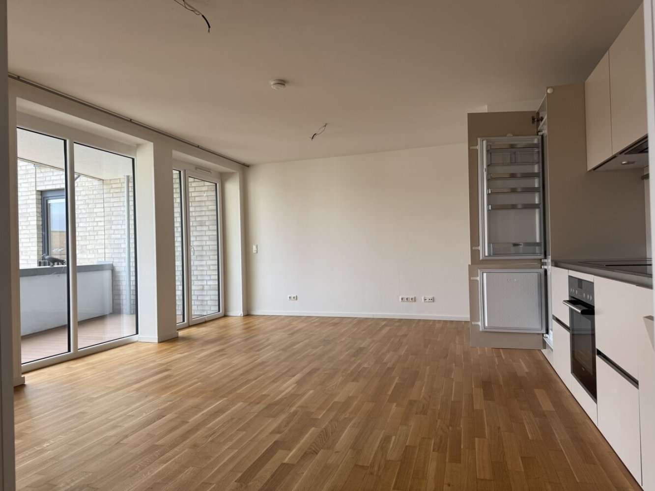 Bereits beim Betreten der Wohnung gelangen Sie über einen kleinen Flur in den zentralen Wohnbereich, der das Herzstück der Wohnung bildet. Das großzügige Wohn- und Esszimmer mit offener Einbauküche schafft eine helle und einladende Atmosphäre. Hier ist ausreichend Platz für einen Essbereich, eine komfortable Wohnlandschaft sowie einen kleinen Homeoffice-Bereich vorhanden. Besonders hervorzuheben ist die große Panorama-Glasfront, die den Raum mit viel Tageslicht durchflutet und den Zugang zum großzügigen Balkon ermöglicht.